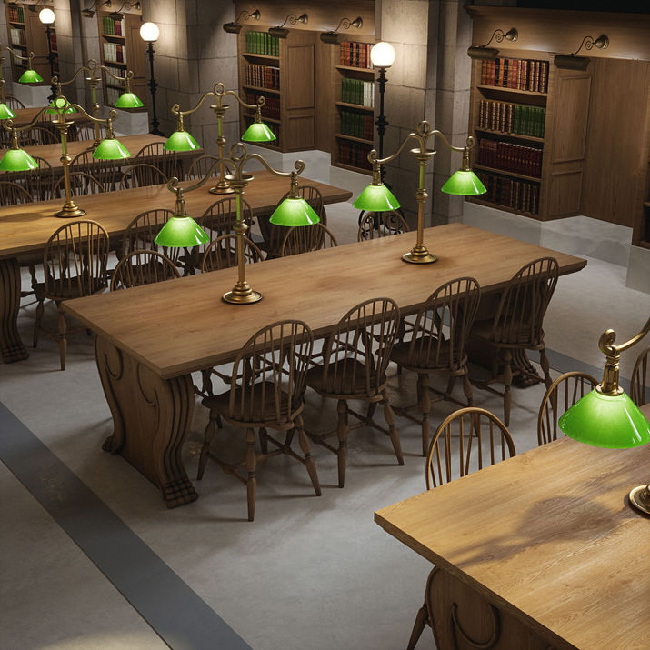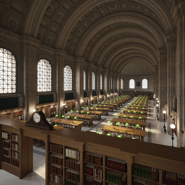 Bates Hall is named for the library's first great benefactor, Joshua Bates (1788-1864). Occupying the whole front of the building on the second floor level and lighted by high arched windows, it is 218 long, 42 feet wide, and 50 feet high, to the top of its barrel vaulted ceiling and created from Ohio sandstone.